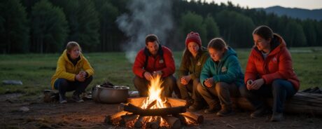 When the sun dipped below the horizon and the air grew chilly, the campers (huddled) close to the campfire for warmth. The crackling flames provided comfort in the cold night.