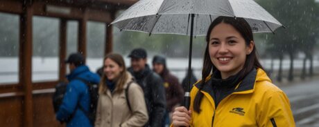 Despite the bad weather, the tour guide remained (cheery ) and encouraged everyone to enjoy the trip.